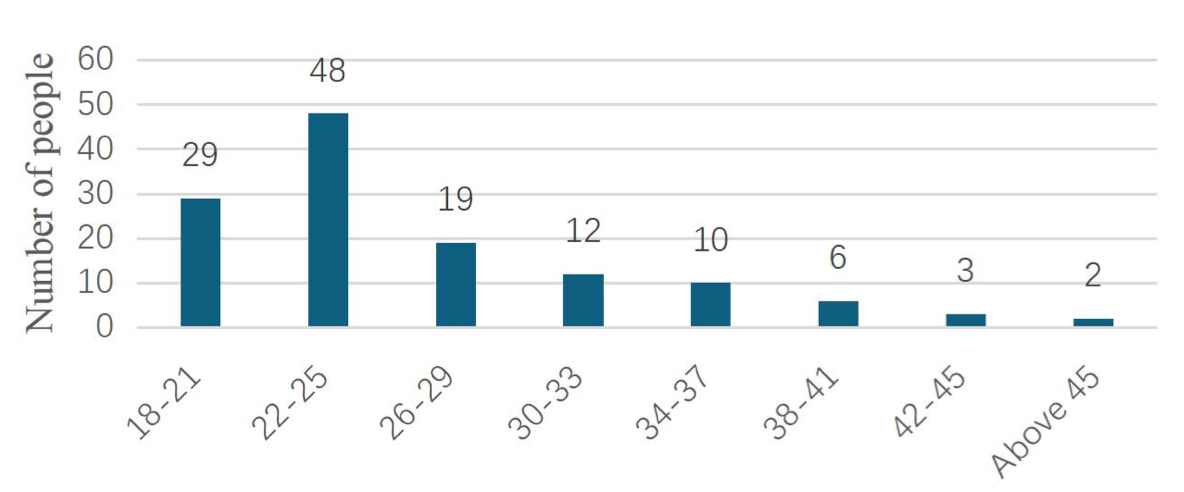 This research yielded a total of 129 valid questionnaires. Among these, 67 were female (51.9%), 59 were male (45.7%), and 3 were non-binary (2.4%). Figure 2 shows the age distribution.
