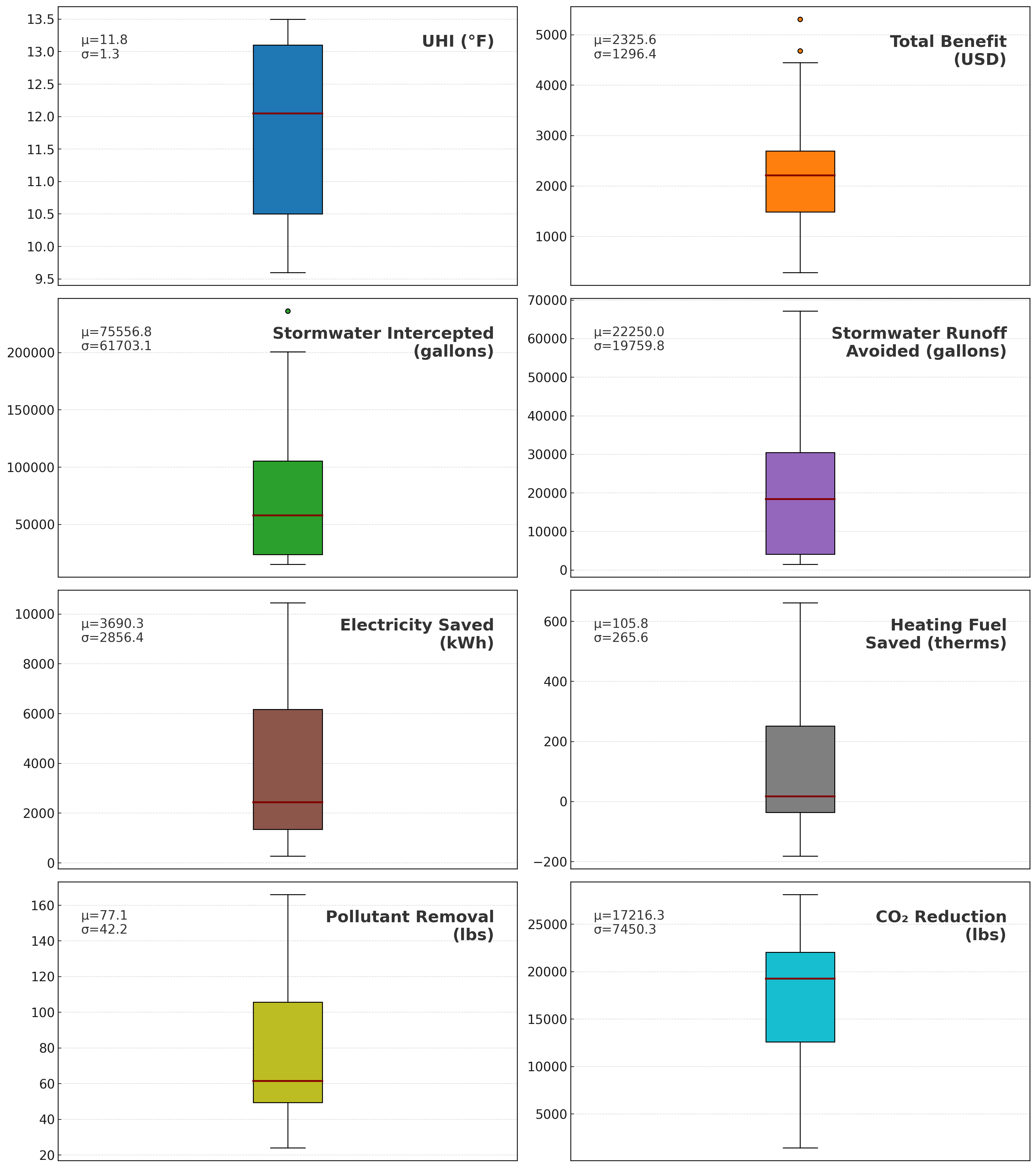 Urban Heat-Island (UHI) hotspots concentrate heat risk and may offer outsized returns from strategic greening. This study evaluates the eco-benefits of planting a single street tree at the maximum UHI hotspot in 20 U.S. cities. Hotspots are identified using a composite UHI index and per-tree services are estimated for their eco-benefits. Results show relatively uniform UHI levels across cities (mean ≈12 °F) but large variability in co-benefits. Hydrological services vary most (stormwater interception spanning an order of magnitude), and energy savings separate along climate lines: hot-summer cities are cooling-dominated (higher electricity savings), whereas colder cities are heating-dominated (greater therm savings, sometimes offsetting cooling gains in warm regions). CO₂ reduction and pollutant removal track interception, and total monetary benefits range widely from a few hundred to several thousand dollars per tree. Multivariate analyses group cities into high-benefit coastal hubs, temperate cooling-dominant sites, and warm-climate locations with winter penalties. Overall, targeted tree planting at UHI hotspots consistently mitigates heat, but realized hydrologic, energy, and carbon returns are strongly place dependent.