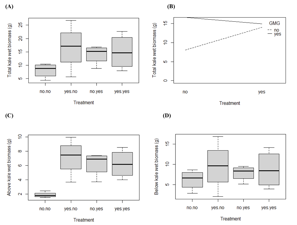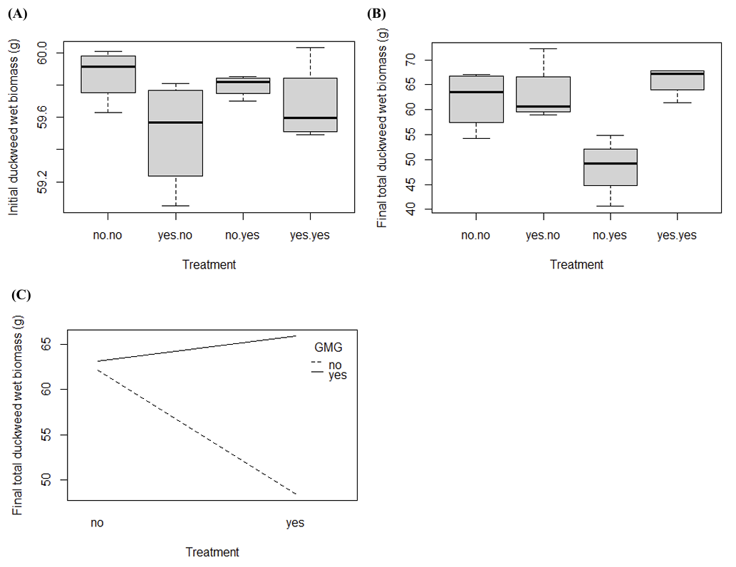 R was used to analyze the data and produce visualizations. Differences between the initial and final duckweed wet biomass were analyzed using two-way analysis of variance (ANOVA) followed by boxplots and an interaction plot. The significance level was considered at p < 0.05. The p-value was significant, so the null hypothesis was rejected. Differences between the kale growth after treatment application were analyzed using two-way ANOVA followed by boxplots and an interaction plot. The significance level was considered at p > 0.05. The p-value was not significant, so the null hypothesis could not be rejected. Differences between inorganic fertilizer and green manure were analyzed using one-way ANOVA. The significance level was considered at p > 0.05. The p-value was not significant, so the null hypothesis was kept.