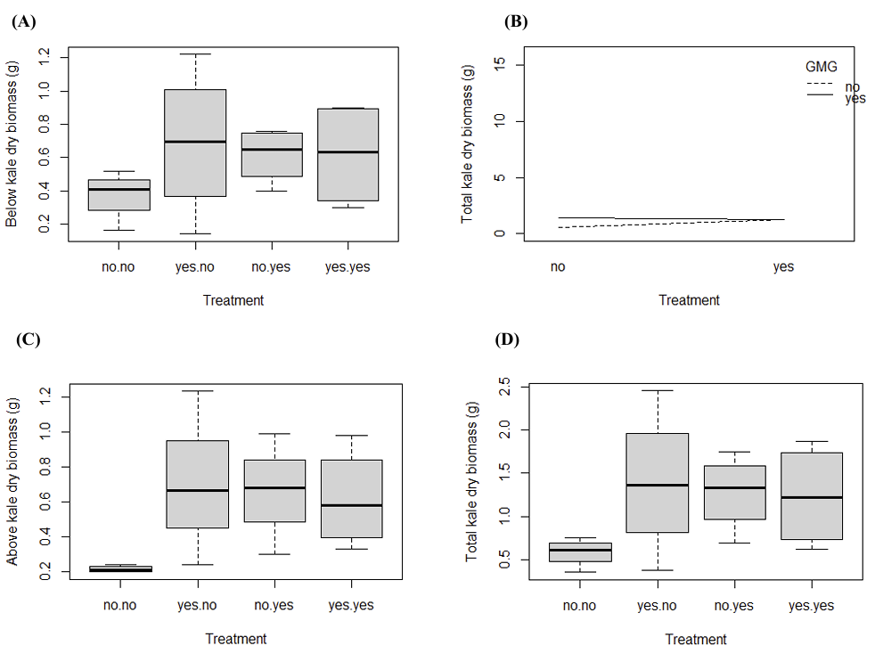 After noting the wet kale biomass, the plants were dried in an oven to determine the dry biomass in grams. The total, aboveground, and belowground dry kale biomass per pot was then weighed. Similar to figures 2A, 2B, and 2D, nothing was statistically significant in figures 3A and 3B (p > 0.05). Figure 3B showed a trend similar to figure 2B, albeit at a smaller scale due to water loss.