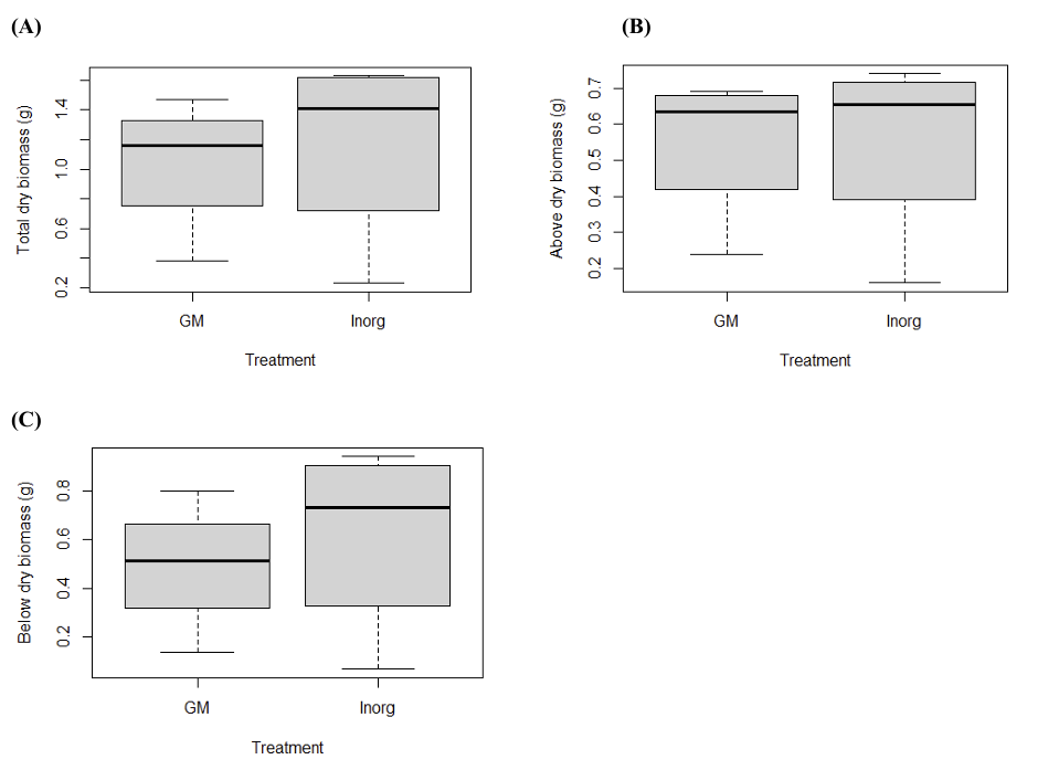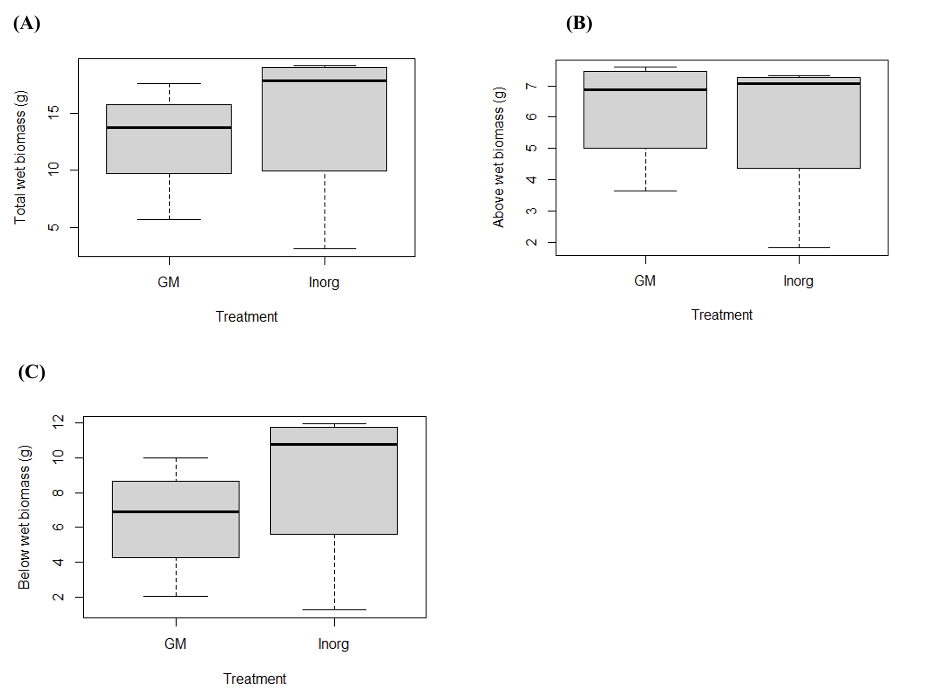Inorganic fertilizer was prepared using Miracle-Gro, while organic fertilizer consisted of untreated green manure. At the end of the kale growth period, the wet biomass per pot was collected and weighed in grams. As shown in Figures 4A, 4B, and 4C, no statistically significant differences were observed between the inorganic and organic fertilizer treatments (p > 0.05). This indicates that, under the conditions of this study, organic green manure performed comparably to the commercial inorganic fertilizer in supporting kale growth. The lack of significant differences may also suggest that the experimental scale and duration were insufficient to capture subtle treatment effects, highlighting the need for larger sample sizes, longer growth periods, and more detailed nutrient analyses in future studies.