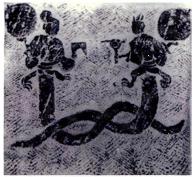 Take the painting of Fuxi and Nuwa on the No. 1 stone coffin unearthed from the cliff tomb in Xinmin Village as an example. Under the two deities, there are two snakes copulating, with their heads pointing respectively to the lower bodies of Fuxi and Nuwa. The implication of copulation is unmistakable. All these express the deceased’s desire to have their life continued and regenerated (Figure 14) [30].