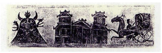 Taking the M1 tomb gate at Guanzhuang as an example (Figure 7) [25], the lintel decoration is divided into inner and outer registers. The outer register features a cloud-scroll pattern, with two long-necked birds standing face to face on top of the inner-register pavilion. The inner register depicts a scene of chariots and riders with a pavilion. The hall depicted in the centre features hanging curtains [10], the door leaves are adorned with huge images of animal-shaped door knockers holding rings in their mouths.