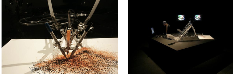 Bio-design utilizes biological principles and natural processes to create products, buildings, or systems that are functional, aesthetic, and sustainable. It expands the application scope of multi-biological effects and combines them with aesthetics, making up for the deficiencies in the application of multi-biological effects in product design and forming design methods and processes from the perspective of product emotionalization, thereby providing clear directions for designers to utilize biological characteristics [6]. This type of design not only focuses on the reproduction of natural forms but also emphasizes the use of biological materials and processes, promoting eco-friendly and renewable design methods. For example, mycelium, plants, or microorganisms are used to create self-healing materials or structures. Bio-design involves working in collaboration with natural organisms, while biomimetic design involves imitating the working principles of nature for artificial design. Artistic installations created by combining bio-design concepts with digital art can respond to external data in real time: through intelligent computers simulating neural networks to transmit and diverge information, and finally presenting it visually through mechanical devices, thereby creating highly interactive digital biological works. "MEART - The Semi-Living Artist" (see Fig. 10) was created by a group of scientists and artists through Symbiotic A, an organization dedicated to developing new biological, ecological, bioethical, neuroscientific, and engineering technologies. "MEART" is one of these research projects, aiming to explore the relationship between living nerve cells and robots. Cultured nerve cells grow in a laboratory; these cells act as a "brain", sending information to a robotic arm that generates two-dimensional drawings (see figure). Data captured by cameras observing the environment around the installation is sent to the laboratory housing these living nerve cells. Based on what happens in the environment, the nerve cells send information to the robotic arm to influence the composition of the drawings. Although these two components of the project are not located in the same geographical location, they can still communicate in real time via the Internet. However, once the nerve cells die, the robotic arm also "dies". The concept behind MEART introduces a platform where biological and artificial organisms can merge into one. The possibilities of what the robotic arm can draw are completely open-ended. When life and technology are combined in this way, people are faced with the question of what happens when independent human capabilities are endowed with the expressive power of machines. The fact that a robot creates these images also raises questions: what can be defined as art, and where does creativity come from? Such a machine—capable of processing its surrounding environment and producing creative outputs—can itself be regarded as an artist.