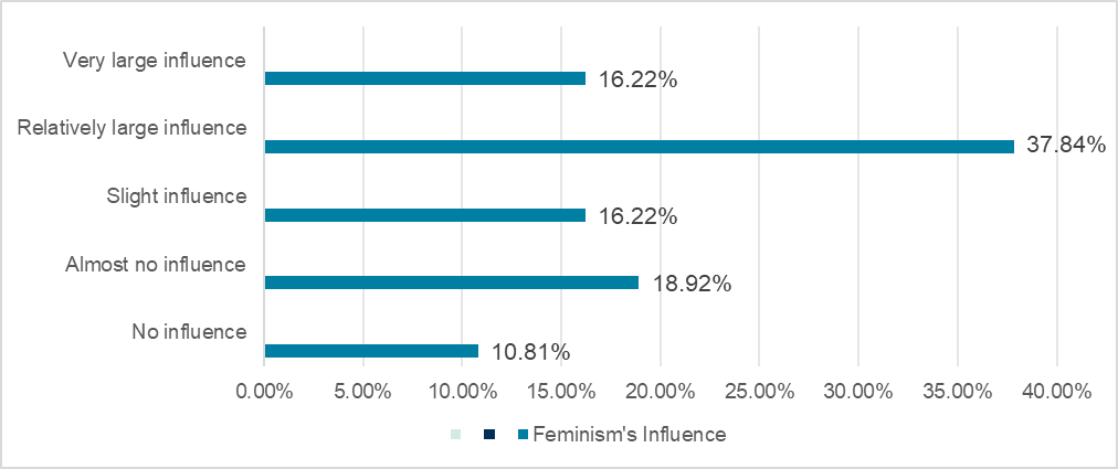 The proportion of those who think it has a relatively large influence is the highest, reaching 37.84%. This indicates that a considerable number of people have had more in-depth exposure and consideration of the feminist trend, and this trend has played a relatively important role in their thinking construction. It may have affected their cognition and views on aspects such as gender roles, social fairness, and interpersonal relationships.