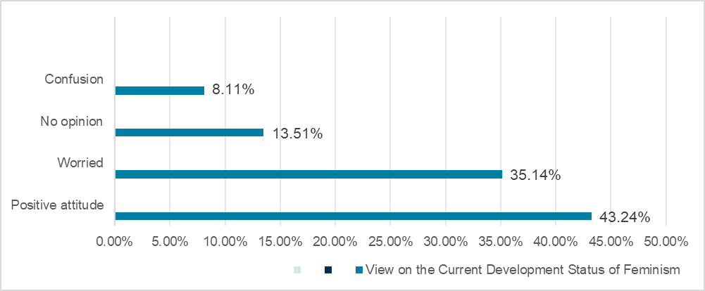 Let's look at the survey results on how people view the current development status of feminism (as shown in Figure 4)—43.24% of the respondents hold a positive attitude towards the current development status, 35.14% are worried, 13.51% have no opinion, and 8.11% express confusion. This shows that there are certain differences in people's views on the development of feminism. Those who hold a positive attitude may have seen the progress made by women in various fields of society and the spread and expansion of feminist ideas and their influence; while those who are worried may have noticed some challenges and difficulties faced in the development of feminism, such as misunderstandings of feminism by some people and the deep-rooted traditional concepts. The groups with no opinion and expressing confusion also reflect that there is still room for improvement in the popularization and dissemination of feminism, and further publicity and education are needed to enhance the public's understanding and awareness of it.