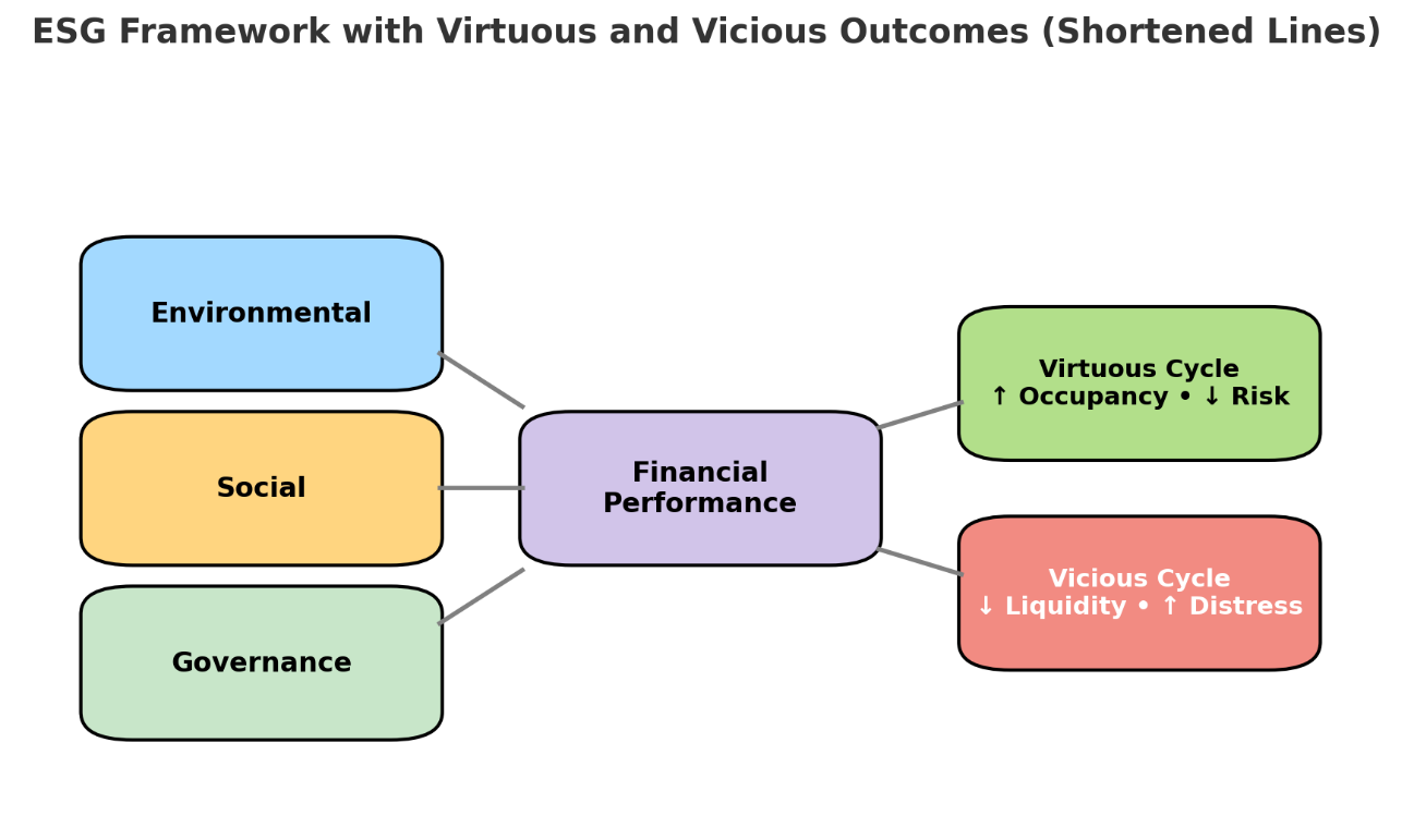 People’s dwellings, daily productive activities and access to public services pass through developers and landlords, exposing them to intense public scrutiny. This paper studies the impact of ESG on the financial outcomes of listed real estate companies. By analysing and summarising global literature, it finds that the relationship is not universally positive or negative, but depends on building age, leverage ratio, ownership structure, and regulatory shocks. It summarises three transmission paths: green energy-saving renovations increase rent and reduce vacancy rates; promoting social projects enhances tenant loyalty; and at the governance level, safeguards limit excessive debt. When these three pillars work together, ESG can compress bond spreads by 25 to 80 basis points and increase occupancy rates by 1 to 2 percentage points. In the green sector with weak governance, ESG can accelerate exit from financial distress, with targeted renovations, joint social project-oriented design, and ruling-class board committees. It ultimately calls for the establishment of unified ESG metrics to enable cross-market comparison.