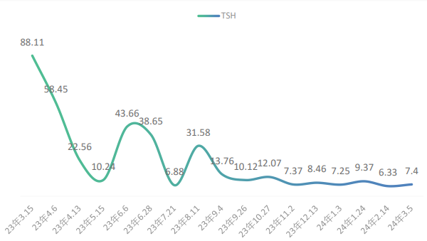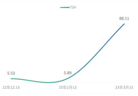 On December 13, 2022, after nine cycles of maintenance monotherapy, the patient developed thyroid dysfunction with the following thyroid function test results: thyroid-stimulating hormone (TSH) 5.53 mIU/L, free triiodothyronine (FT3) 4.23 pmol/L, and free thyroxine (FT4) 15.84 pmol/L. According to the toxicity grading and management principles outlined in the 2023 edition of the CSCO Guidelines for the Management of Toxicities Related to Immune Checkpoint Inhibitors (hereinafter referred to as the same principles), the condition was graded as G1. No special intervention was performed, and the patient proceeded to the next chemotherapy cycle. On February 12, 2023 (after the 11th cycle), repeat thyroid function tests showed TSH 5.89 mIU/L, FT3 4.78 pmol/L, and FT4 13.88 pmol/L. On March 15, 2023 (after the 12th cycle), thyroid function results were TSH 88.11 mIU/L, FT3 2.51 pmol/L, and FT4 4.38 pmol/L. The patient’s TSH level continued to rise abnormally (see Figure 1), and a clinical diagnosis of hypothyroidism was made. According to the toxicity grading principles, this was graded as G2. Immunotherapy with immune checkpoint inhibitors was suspended, and the patient was started on oral levothyroxine sodium 50 μg once daily for hypothyroidism. On April 13, 2023, the patient’s TSH level decreased to 22.56 mIU/L, and on April 23, atezolizumab monotherapy was resumed for the 13th cycle. After treatment was resumed, thyroid function tests were conducted every 4–6 weeks (see Figure 2). On June 6, 2023, TSH was found to have increased again to 43.66 mIU/L. After clinical pharmacist intervention, poor medication adherence was suspected. It was recommended that the patient’s adherence be assessed using the Morisky Medication Adherence Scale, and targeted medication education and counseling for thyroid dysfunction were provided. Subsequently, the patient returned regularly every 4–6 weeks for follow-up. His TSH levels remained stably at a relatively low abnormal range, and his hypothyroidism was brought under control.