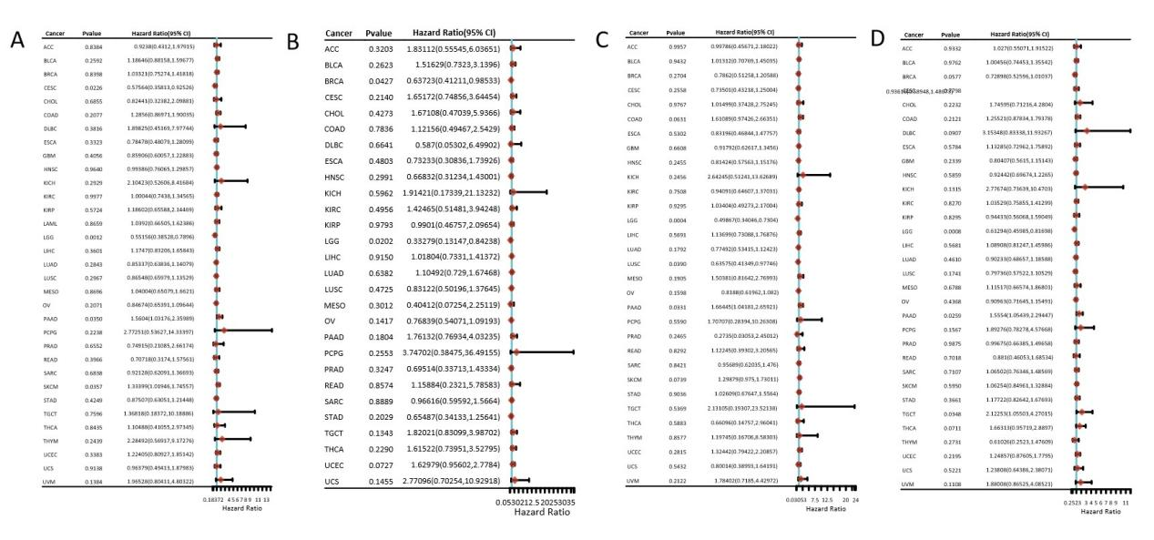 Forest plots and Kaplan-Meier curves were used to examine the relationship between VTCN1 expression and patient prognosis in 33 types of cancers, including overall survival (OS), disease-free survival (DFS), disease-specific survival (DSS), and progression-free survival (PFS). Univariate survival analysis was used to calculate hazard ratios (HRs) and 95% confidence intervals (CIs).
