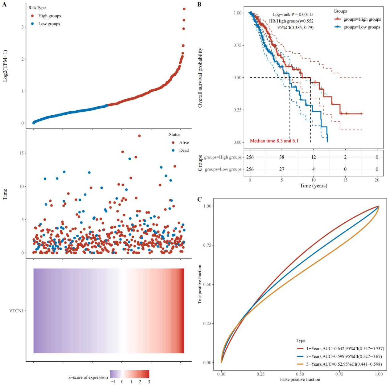 Figure 2. Kaplan-Meier survival curves of VTCN1 in LGG. A: The relationship between gene expression and survival time as well as survival status in TCGA data. B: KM survival curve of the gene in TCGA data. C: ROC curves and AUC values of the gene at different time points.