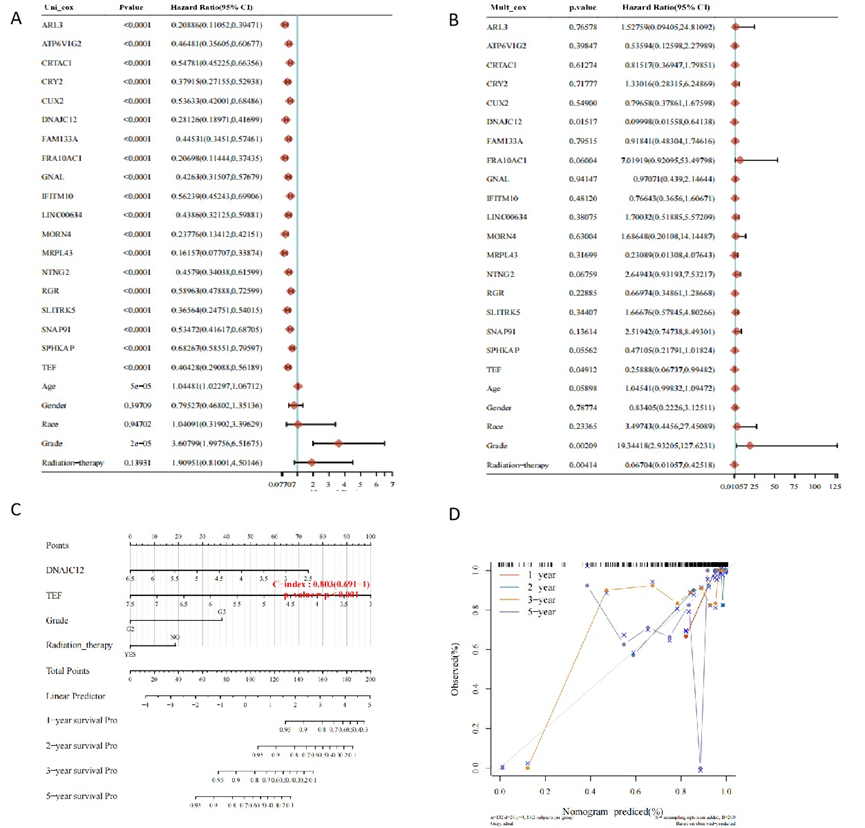RNA-seq data and corresponding clinical information of LGG were obtained from The Cancer Genome Atlas (TCGA) dataset (https://portal.gdc.com). First, univariate and multivariate Cox regression analyses were performed, and forest plots were generated using the "forestplot" package to display each variable (P value, HR, and 95% CI). Based on the results of multivariate Cox proportional hazards analysis, a nomogram was constructed using the "rms" package to predict the X-year overall recurrence rate. The nomogram provides a graphical representation of these factors, and the prognostic risk of individual patients can be calculated based on the points associated with each risk factor.