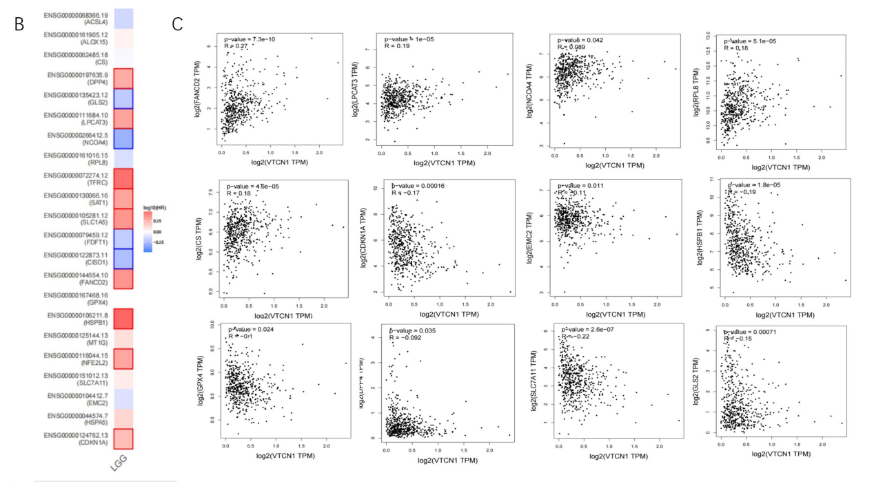 Based on bioinformatics methods, this study infers that VTCN1 has certain reference value in the development and research of LGG prognostic biomarkers. High VTCN1 expression affects the cell cycle, apoptosis, and oxidative stress through DNAJC12 and TEF, and influences iron homeostasis through NCOA4, thereby participating in the occurrence and development of LGG. In addition, high tumor mutational burden and the infiltration of relevant immune cells may also play important roles.