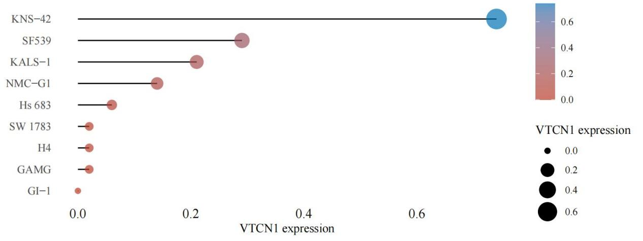 The gene expression matrix of LGG cell lines was obtained from the CCLE (Cancer Cell Line Encyclopedia) database (https://portals.broadinstitute.org/ccle/about). The expression level of VTCN1 in the same tumor was observed to obtain the expression status of this gene in different cell lines.