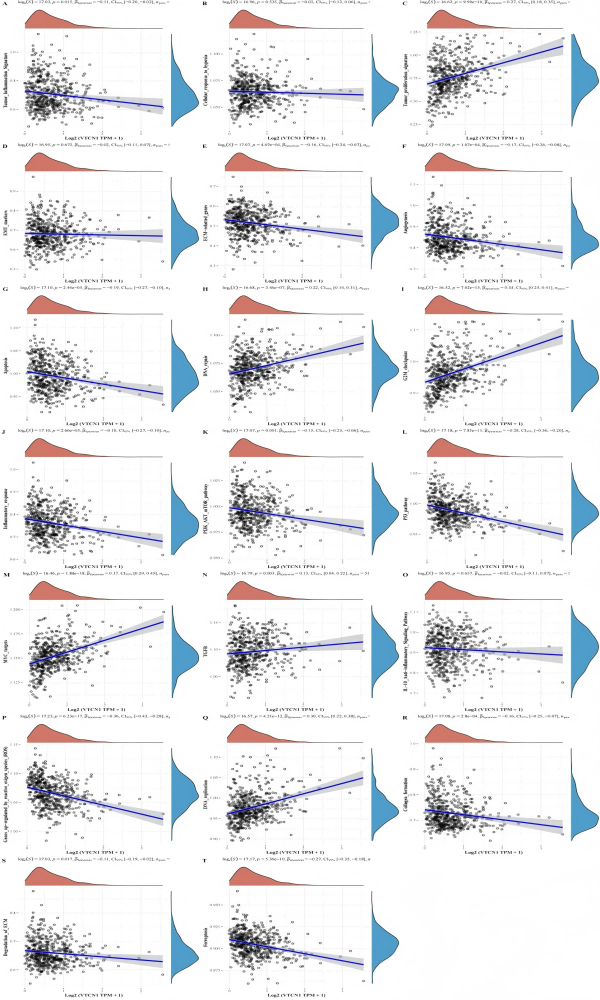 Gene sets involved in relevant pathways were collected (DOI: 10.3390/cancers12071788). According to the ssGSEA (single-sample Gene Set Enrichment Analysis) algorithm, the enrichment score of each sample in each pathway was calculated sequentially, thereby obtaining the association between LGG samples and pathways. By calculating the correlation between gene expression and pathway scores, the relationship between VTCN1 and pathways was finally obtained by analyzing the correlation between VTCN1 and pathway scores using Spearman correlation analysis.