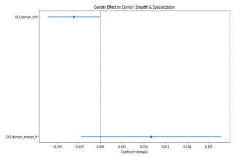 For H4 (Issue Breadth), this research ran ordinary least squares (OLS) regressions (and panel regressions with legislator fixed effects for robustness) on the diversity indices (entropy and –HHI). Each observation in these models is a legislator-year. The dependent variable is the entropy or negative HHI of that member’s questions in that year. The key independent variable is the legislator’s gender (female=1), and this research control for the total number of questions the member asked that year (since asking more questions naturally allows covering more topics). Year fixed effects are included, and in the panel specification This research also incorporate legislator fixed effects to account for unobserved individual traits. A significantly positive coefficient on female for entropy (or significantly negative for HHI) would indicate that female legislators tend to cover a more diverse range of topics in their questioning than male legislators.