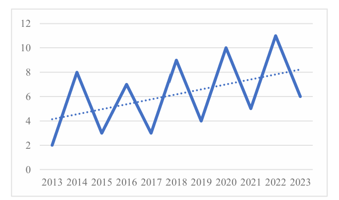 Figure 2 shows a steady increase in scholarly publications on information security management (ISM) in universities over recent years, reflecting growing interest in this area. Geographic Distribution: The studies demonstrate significant geographic diversity, with the majority conducted in the US (6 studies), followed by Malaysia (4), China (4), Indonesia (3), Canada (2), and New Zealand (2). Sample Populations: The literature utilizes a range of sample populations, including students, IT staff, and administrative personnel. Notably, 25 studies evaluated ISM effectiveness, 7 analyzed students' unsafe behaviors, and 5 focused on university information systems. Research Methodologies: Methodological approaches are varied. Conceptual frameworks are the most common, complemented by descriptive statistics (e.g., assessing guideline implementation), regression analysis, and structural equation modeling. Data collection methods primarily include surveys, questionnaires, interviews, and laboratory tests, allowing for in-depth analysis of ISM practices in higher education institutions. These findings underscore the diversity of ISM research in universities, highlighting a range of geographic, demographic, and methodological approaches used to explore information security in academic settings.