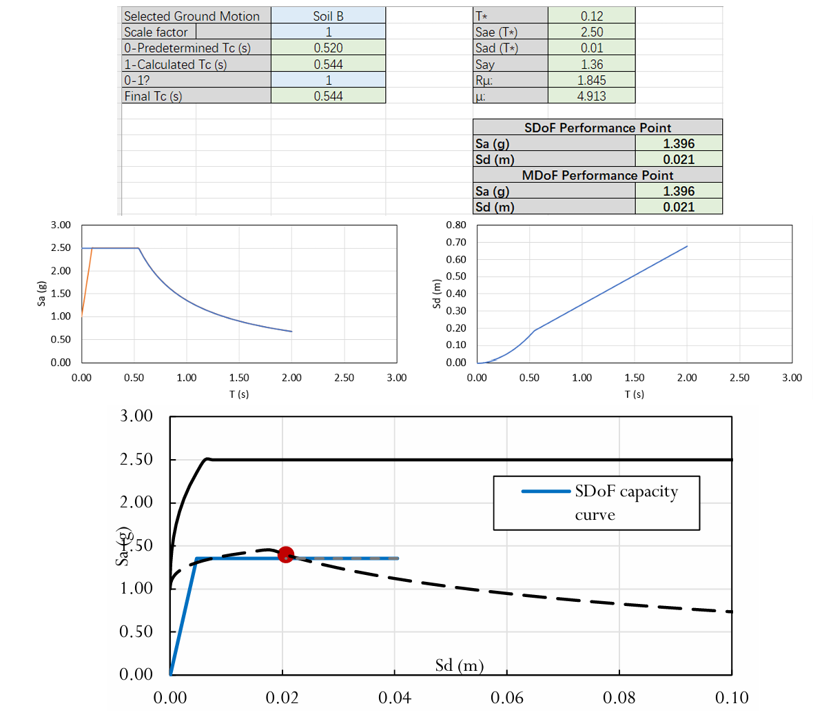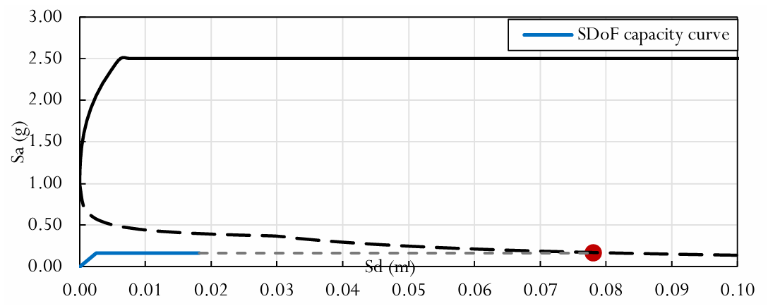 The N2 method is a method for determining the seismic strength of a structure based on the response spectrum under seismic action. This approach involves converting the capacity curve of a structure with multiple degrees of freedom (MDoF) into an equivalent capacity curve for a single degree of freedom (SDoF). The resulting curve is then compared to the inelastic response spectrum to determine the performance point of the structure. This performance point is then compared to predefined thresholds for different damage states, which allows for an assessment of the building's seismic performance [5]. The results are shown below:
