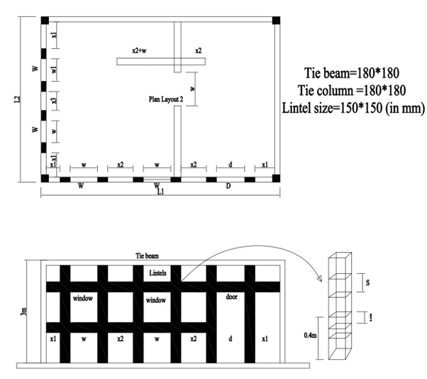 The project is a single-storey Confined masonry building whose layout is shown in Figure 1. Where L1=7m, L2=4.6m, X1=0.4m, X2=0.7m, W=1.6m, d=1.6m, X3 = 0.6m. The building is located in the high' seismic zone (PGA range 0.25g to 0.4g), in soil type B.