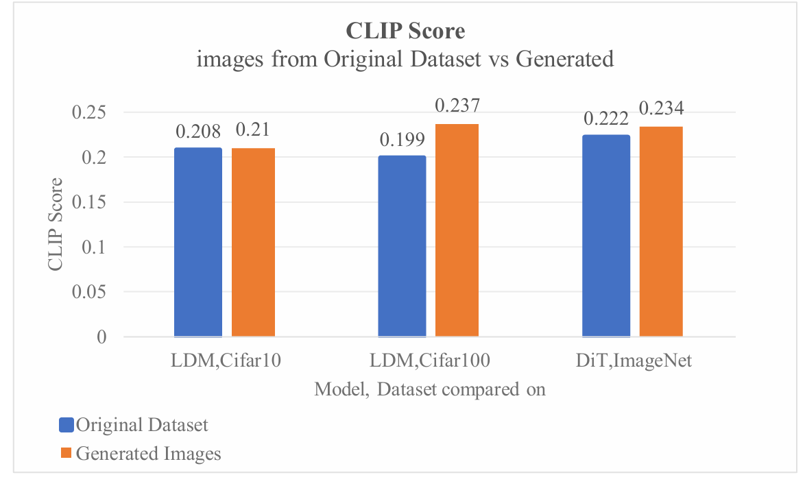 CLIP Score utilized the CLIP model. In this paper, ViT model is used to obtain image embeddings and text transfomrer is used to obtain text embeddings in the CLIP model. 5 images or 10 images are generated from the same class and a total of the embeddings are normalized to the interval [0, 1], these embeddings is then evaluated with all the text prompts that used to generate the images or those that describe the images, using the cosine similarity. The similarity values are averaged between all the images in the same class. For example, if each class has 5 images, the mean of the 5 similarity values will be the final average score for this class. Comparisons of CLIP Scores. In this paper, LDM is pretrained by using the LAION5B dataset and DiT model is pretrained by using ImageNet dataset. This paper compares the CLIP Scores for the generated images and the images from the original dataset by using these two models.