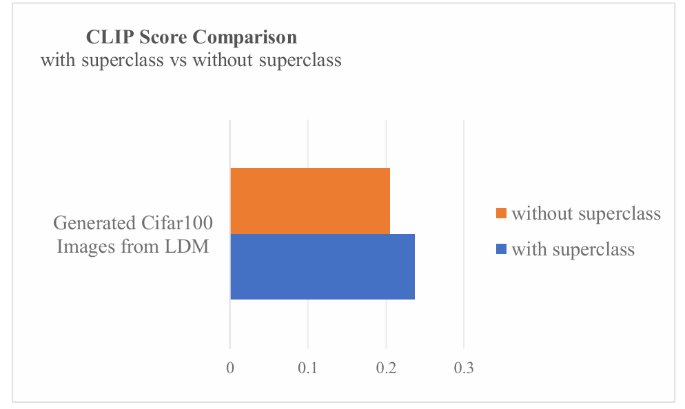 As Shown in figure 2 the images Cifar10 dataset and the ImageNet dataset have similar CLIP Scores with the generated images. However, there is a large difference between the CLIP Scores of the Cifar100 dataset and the generated images. A possible reason for this is the classifier prompts for the Cifar100 are formed by combining the superclass labels and the specific class labels. As mentioned before, the Cifar100 dataset’s labels look like “aquatic mammal beaver”, and the Cifar10 dataset’s class labels look like “airplane”. This is shown in figure 3, with the removal of the superclass labels in Cifar100, the CLIP Score decreases by 13% of the original Score. Two causes could lead to such a result. First, the difference between prompts that generated the image and the prompts that removed the superclass names are now different. Second, the prompts without superclass names now have reduced relevant information than the original prompt. Comparison of CLIP Scores between prompts that used superclass and those without superclass added.
