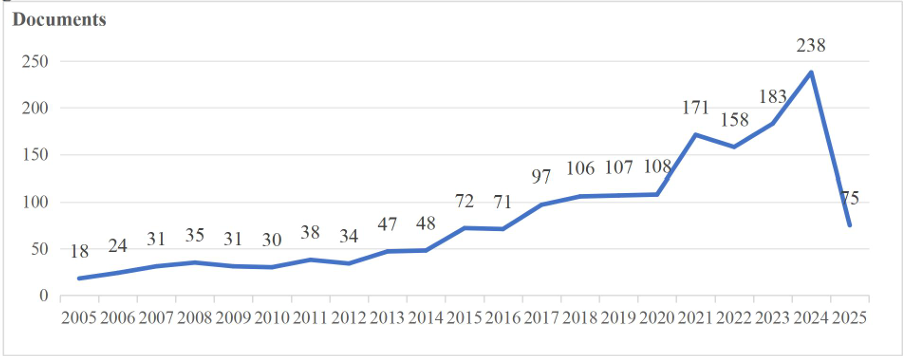 (3) Outbreak and Fluctuation Stage(2021–2025):During this period, the annual publication output increased dramatically, with a growth rate of 58.3%in 2021,and reaching a peak of 238 papers in 2024.In 2023,the Tokyo MoU and Paris MoU memoranda organizations designated “fire safety” as the theme for the Joint Concentrated Inspection Campaign(CIC),prompting countries to strengthen fire safety management on ships. Meanwhile, the development of clean energy reached a mature stage, with liquefied natural gas (LNG)and hydrogen fuel cells increasingly being used as power sources for ships. The characteristics of fires on these ships differ significantly from those on traditional fuel-powered ships. The digital and intelligent transformation of the shipping industry also accelerated, with higher levels of ship automation introducing new fire risk factors, attracting a large number of researchers to the field.