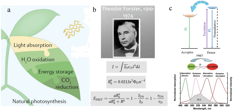 FRET is a non radiative energy transfer process, which occurs between two fluorescent molecules (or chromophores). It was established by German physicist Theodor Förster through theoretical derivation in the 1940s [14], so it is named after it (Fig. 1a). It is an important tool for studying intermolecular interactions in biophysics, molecular biology and analytical chemistry.