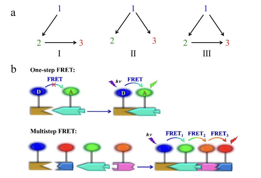 In recent years, FRET's energy transfer system has been expanded from the traditional single donor/acceptor system to a trichromatic system using two or more donor/acceptor pairs [16-22]. The trichromatic energy transfer system is composed of two donor/acceptor pairs that share the same chromophore, including three energy transfer paths (Fig. 2a):