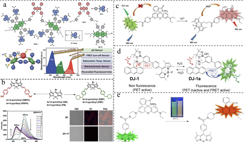 The Rani team used naphthyl imine as the donor, peryl imine as the intermediate acceptor, and Aza-BODIPY as the final acceptor to construct a two-step cascading SS-FRET system via covalent bonding [23] (Figure 3a). This system successfully achieved near-infrared emission at 721 nm and demonstrated excellent stimulus responsiveness. The Yu team developed a ratio-fluorescence probe with BODIPY-rhodamine for sensitive detection of Hg²⁺ ions [24] (Figure 3b). In the presence of Hg²⁺ ions, the hydrolysis of rhodamine's spirocaprolactam leads to SS-FRET between BODIPY and rhodamine, causing the system's fluorescence color to shift from green to orange. The Ooyama team developed a BODIPY-based fluorescent sensor using SS-FRET to measure trace amounts of water in organic samples [25] (Figure 3c). Using a similar strategy, the Li team developed two probes for detecting Fe³⁺, demonstrating high sensitivity and selectivity in live cells [26](Figure 3d). The Liu team developed a FRET fluorescent sensor based on the BODIPY and rhodamine thiocyanate system, which can effectively detect HOCl in live cells [27] (Figure 3e).