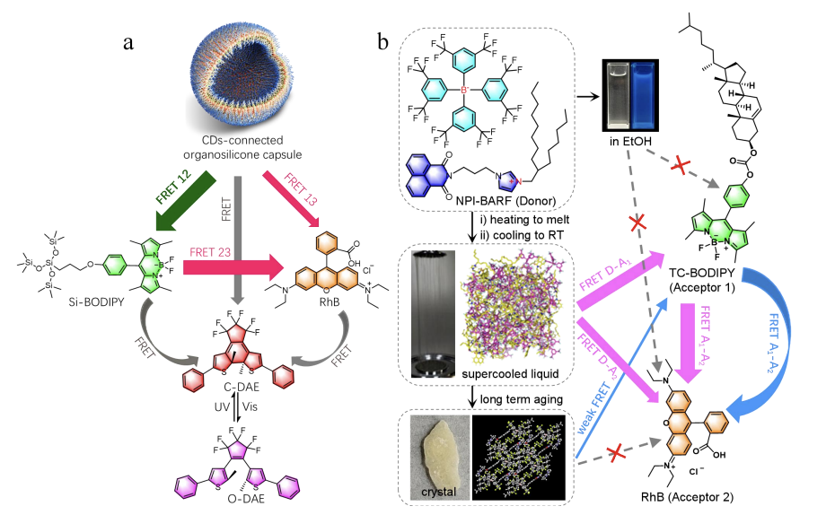 In nature, photosynthetic organisms achieve directed solar energy transfer and conversion through sophisticated light-harvesting complexes, a process closely related to Förster resonance energy transfer (FRET). If we focus solely on single photons capable of exciting chlorophyll molecules, the maximum energy transfer efficiency can reach ~95%. Inspired by this, a large number of artificial light harvesting systems (ALHSs) based on cascaded FRET have been developed. However, only a few examples have achieved an overall energy transfer efficiency exceeding 80%. Recently, Li group has made a breakthrough in this field. They prepared a novel organosilicon capsule (CDs-Si) using citric acid (CA) and amphiphilic polydimethylsiloxane as carbon sources via a solvent-free pyrolysis method [30]. The wide emission spectrum of the capsules covers the absorption spectra of green (siloxane-functionalized BODIPY, Si-BODIPY) and red (rhodamine B, RhB) dyes, promoting FRET in the CDs-Si/Si-BODIPY and CDs-Si/RhB binary systems. In the CDs-Si/Si-BODIPY/RhB ternary system, cascaded SS-FRET from CDs-Si to Si-BODIPY to RhB was achieved, accompanied by parallel FRET from CDs-Si directly to RhB, with an overall energy transfer efficiency of ~86%. By introducing photoswitching molecules (diaryl ethylene compounds, DAE), the system achieves switchable luminescence under alternating ultraviolet and visible light irradiation, forming intelligent AHLSs.