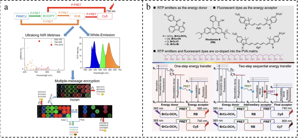 Tang et al. constructed a multi-step TS-FRET system in a PVA matrix using 1-bromocarbazole derivatives with ultra-long blue RTP emission as the donor [33], RhB as the intermediate acceptor, and NIR dyes Cy5 or Cy7 as the final acceptor (Figure 1-18b). By adjusting the donor-acceptor ratio, the team successfully achieved long-lived phosphorescence emission spanning the visible to near-infrared regions. Compared to single-step TS-FRET, two-step sequential TS-FRET exhibits higher overall energy transfer efficiency, richer phosphorescence colors, and higher RTP quantum yields for the final acceptor. These water-soluble polymer afterglow materials with ultra-long lifetime, multicolor emission, and persistent near-infrared luminescence demonstrate significant potential applications in advanced anti-counterfeiting and information security technologies.