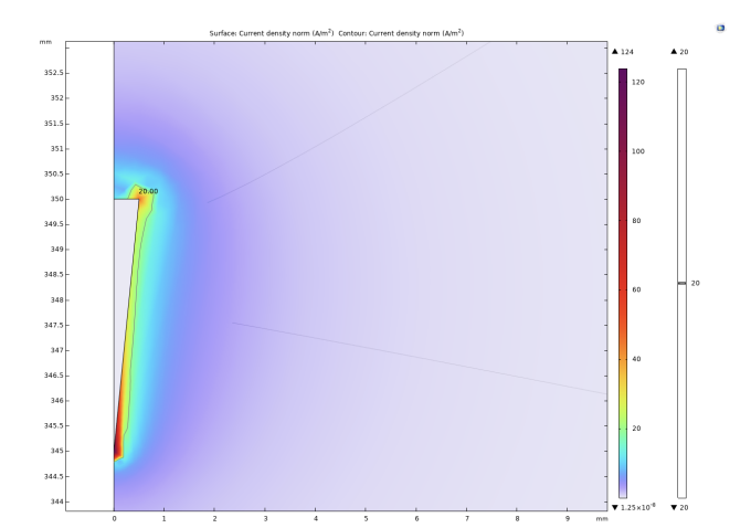 The experiment selected 20A/m² as the threshold current density. When the current density modulus at a point in space is greater than the threshold current density, it is considered that the neuron at that point can be activated. It can be intuitively seen from Figure 2, 3, and 4 that as the radius of the lower surface of the columnar electrode decreases, the discharge efficiency of the electrode increases significantly, and the range within which the current density mode is sufficient to activate neurons expands significantly. Let the horizontal distance from the outermost end of the lower surface of the electrode to the threshold current density be the discharge radius.