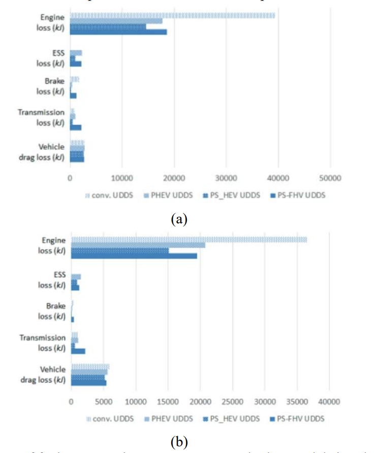 Figure 16. The fuel economy of HWFET in high-speed cycles is 19.8 kilometers per liter. The urban cycle of UDDS is 15.1 kilometers per liter. Thus, it can be said that the higher the SOC value, the better the vehicle's acceleration performance. Under 100% SOC conditions, the acceleration performance was enhanced by 42%. From the economy of fuel chart that the fuel economy of PS-FHV lies between that of the other two models. Although it is not outstanding in terms of fuel economy and still has room for improvement, it has excellent acceleration performance.