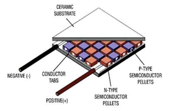 TEGs are devices that convert heat energy to electricity according to the Seebeck effect. As shown in Figure 1, TEGs consist of n-type and p-type semiconductors that are electrically connected in series [2]. This application enables the recovery of waste heat, such as the heat from the exhaust system of an automobile. As shown in Figure 2, the Variable Conductance Thermosiphon (VCTS) constitutes a closed chamber/pipe containing an evaporator at the bottom. The evaporator is connected to a condenser where the TEG modules are mounted. The efficiency of these units depends on the temperature range of the automobile. TEGs are attractive modules for automotive vehicle because they do not need moving parts, cutting down maintenance costs [5].