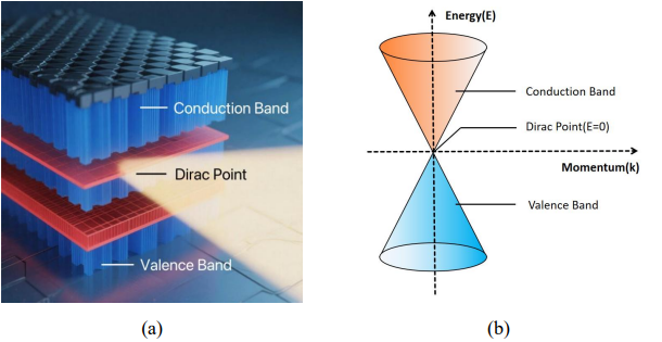 Graphene is a zero-bandgap material, with its valence band and conduction band directly connected at the Dirac point. As shown in Figure 1(a), the schematic diagram of the graphene band structure demonstrates the relative positions among the three. In addition, its linear dispersion relationship is usually shown by a Dirac cone as shown in Figure 1(b), where the horizontal axis represents momentum k and the vertical axis represents energy E. The upper half-cone (E>0) is the conduction band, the lower half-cone (E<0) is the valence band, and the intersection point E=0 is the Dirac point. Because there is no place to accommodate electrons at this point, electrons can transition instantaneously without overcoming the band gap, thus enabling graphene to exhibit ultra-fast response in the optical communication band. However, when the light intensity exceeds the saturation absorption threshold of graphene (0.5MWcm-2), the valence band at the top and the conduction band at the bottom are respectively filled with photogenerated electrons and holes, generating the Pauli blocking effect, which can no longer accommodate new electron pairs. As a result, the absorption coefficient decreases with the increase of light intensity, thereby achieving all-optical modulation that varies with light intensity [4].