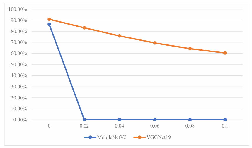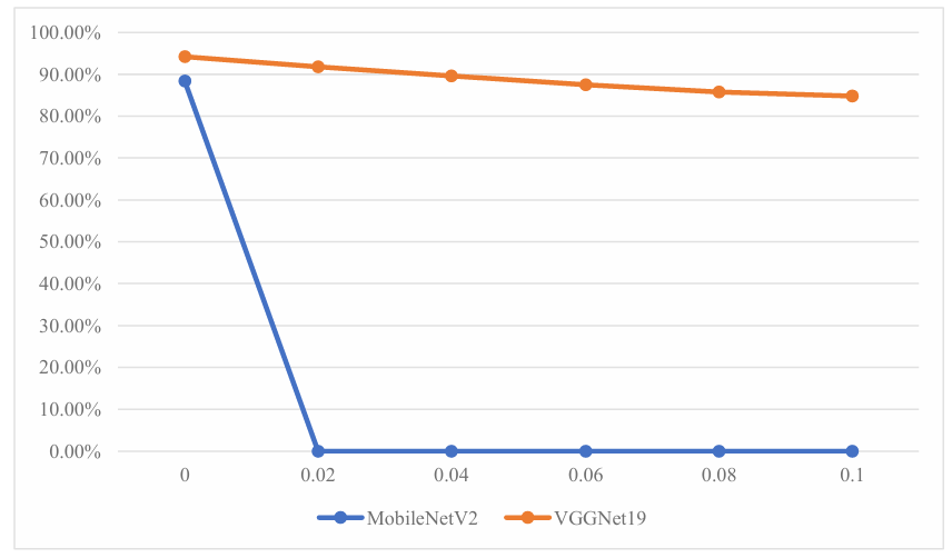 From the above data, it can be seen that when ε was 0, although both models recognized the traffic signs, VGGNet19 demonstrated higher accuracy than MobileNetV2. Later, when the ε value was set to 0.02, MobileNetV2 mistakenly recognized the speed limit sign of 30 as 60 and the confidence level had dropped to 0%. Similarly, the speed limit sign of 60 was recognized as 30 and the confidence level was also reduced to 0%. In contrast, VGGNet19 can still accurately identify speed limit signs at 30 and 60, and it still has a relatively high confidence level. Moreover, as ε gradually increases to 0.1, VGGNet19 can still maintain correct identification of signs. However, MobileNetV2 has always wrongly identified traffic signs and its confidence level has always been 0%.