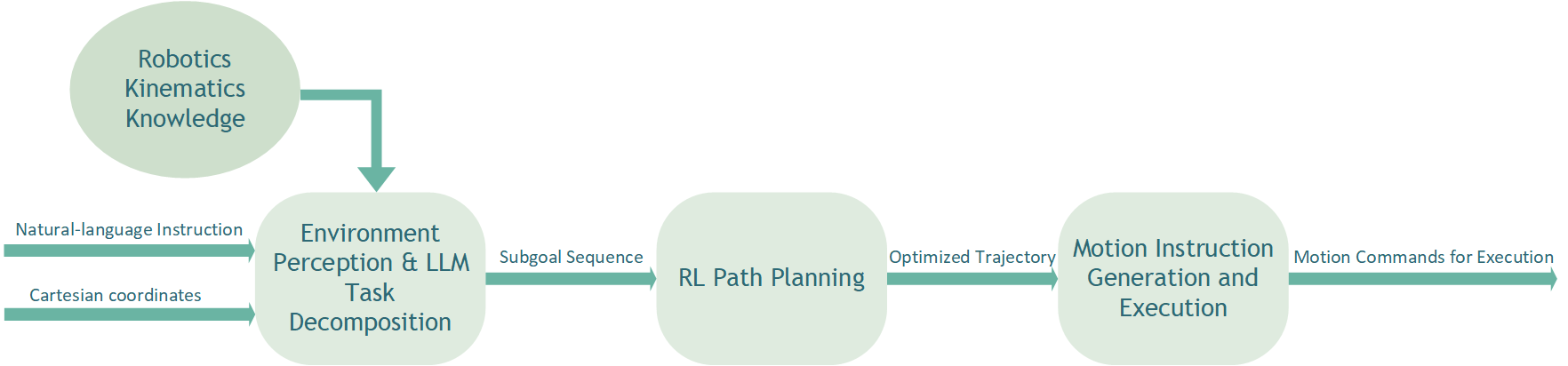Robot control is a current research hotspot, with robotic arm trajectory planning being a key direction. However, traditional methods exhibit insufficient adaptability and flexibility, making it difficult to meet the demands of complex tasks and dynamic environments. This paper proposes a path planning system based on the collaboration of reinforcement learning (RL) and large language models (LLM). The system consists of three modules: environment perception and LLM-based task decomposition and scheduling, RL-based trajectory planning, and motion command generation. By integrating the cognitive capabilities of LLM with the optimization capabilities of RL, the system enables task-driven robotic arm trajectory planning. In terms of design, the upper layer employs LLM for task analysis and high-level command generation, while the lower layer uses RL for trajectory optimization, forming a hierarchical collaborative mechanism. To verify its effectiveness, experiments were conducted on both simulated and real COBOT platforms for a static block-grabbing task, comparing three schemes: pure RL, pure LLM, and the proposed LLM-RL fusion. Results show that the LLM-RL approach outperforms the baselines in terms of average path length and execution time, while also significantly improving RL training efficiency.