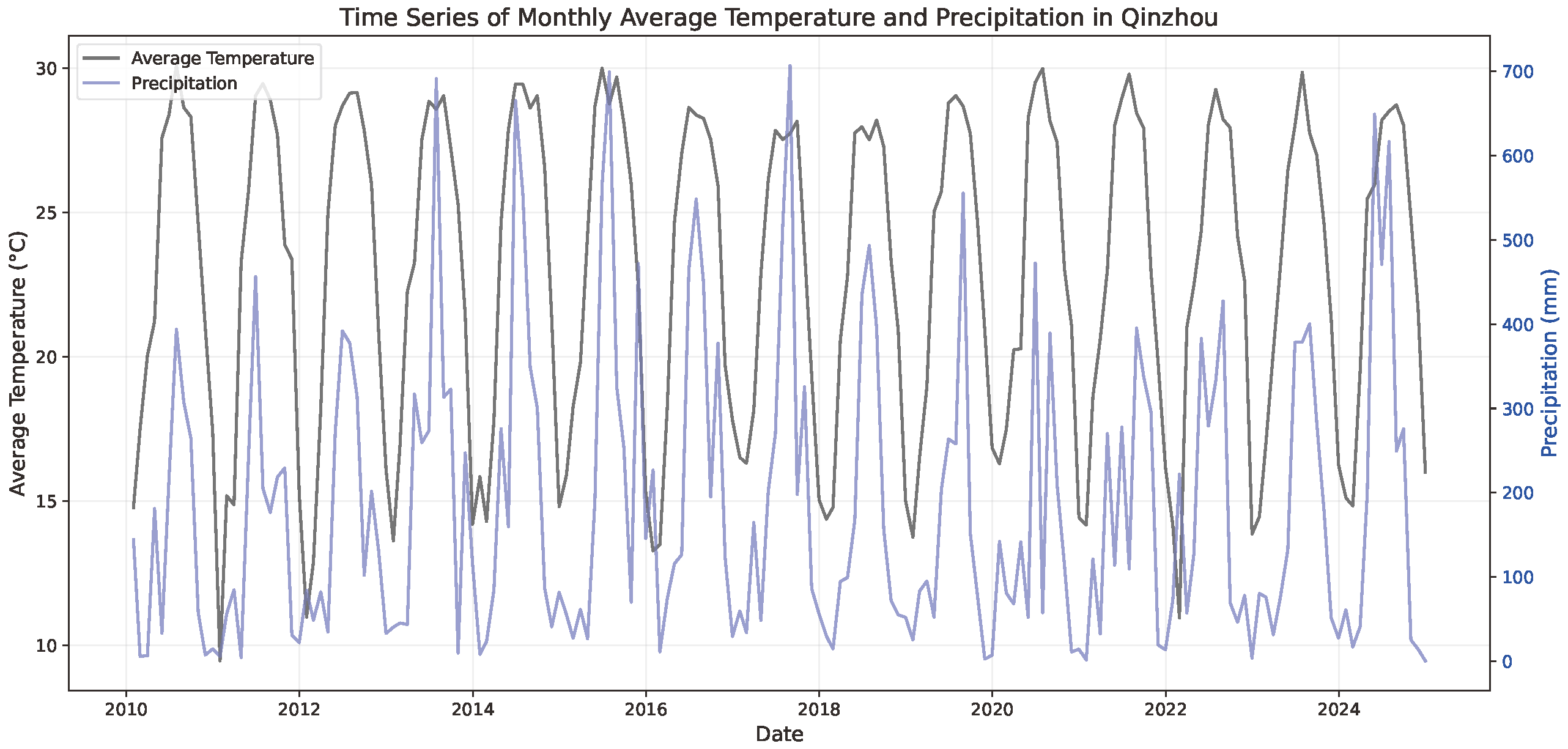 Qinzhou, Guangxi Zhuang Autonomous Region, China, experiences intense seasonal precipitation and relatively high temperatures, which often lead to droughts or floods. Forecasting precipitation and temperature is an essential step in taking precautions against damages caused by weather. The Seasonal Autoregressive Integrated Moving Average (SARIMA) model is effective for forecasting time series with regular patterns. This paper uses the SARIMA model to forecast the monthly precipitation and average temperature of Qinzhou. The training set comprises data provided by the National Oceanic and Atmospheric Administration (NOAA) from 2010 to 2022, inclusive, while data from 2023 to 2024 are used as the test set. By analyzing the augmented Dickey-Fuller (ADF) test results, and comparing Akaike information criterion (AIC) values and models' accuracy, sets of reasonable model parameters are selected. Coefficients of determination (R2) suggest the SARIMA model can effectively forecast monthly average temperature and precipitation, but it shows shortcomings in capturing unexpected extreme values.