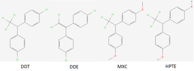 This paper explores the estrogenic interference effects of DDT and its substitutes and metabolites using molecular docking techniques and analyzes the related mechanisms of action. In addition, DDT and its alternative metoxyddt (MXC), as well as their respective metabolites, DDT (DDE) and 2, 2-bis (4-hydroxybenzene) -1,1, 1-trichloroethane (HPTE), were selected as ligand molecules for docking. AutoDock software was used for molecular docking with the estrogen receptor (ER)α. Both MXC and HPTE can form a hydrogen bond with the Arg394 residue of ERα, and the optimal binding energies of DDT, DDE, MXC and HPTE to ERα are -5.67, -6.21, -5.03 and -5.48 5.48kcal/mol, respectively. The binding forces of ERα to the above four molecules, from high to low, are DDE>DDT>HPTE>MXC. ERα has sufficient affinity for DDT, DDE, MXC, and HPTE. The binding affinity of DDT and DDE to ERα is mainly provided by hydrophobic interaction with the non-polar residue of the receptor. In contrast, the binding affinity of MXC and HPTE to ERα is primarily supplied by hydrophobic interaction with the non-polar residue of the receptor and hydrogen bond formation with the key residue. MXC shows a weaker affinity for the receptor than DDT, and HPTE shows a stronger affinity for the estrogen receptor than MXC.