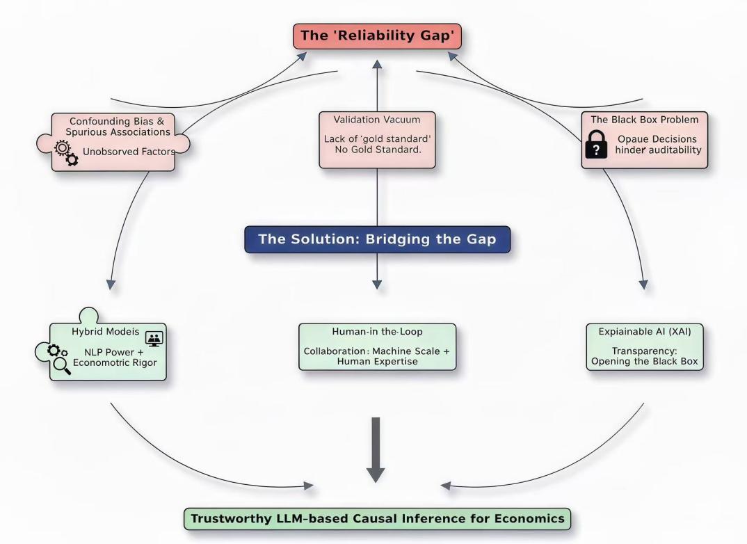 Large Language Models (LLMs) are driving a paradigm shift in economic causal inference, thereby enabling the direct quantification of causal effects from unstructured text. However, this transformation comes with a significant reliability gap. Existing approaches, whether using text as a proxy, extracting causal chains, or treating LLMs as world models, are constrained by three interconnected challenges: persistent confounding, a lack of robust validation standards, and limited interpretability. Through a review of more than 30 studies in text analysis, causal science, and computational economics, the results show that, unless the reliability gap is directly addressed, LLMs are likely to remain promising black boxes and cannot yet serve as reliable tools for policy analysis or scientific discovery. To enhance credibility, research efforts should go beyond exploring model capabilities, and reliability can be improved via a multi-pronged approach involving hybrid models, human-machine collaboration, and Explainable AI (XAI). Consequently, the paper aims to guide this critical transition and future research to develop reliable and accountable LLMs for economics.