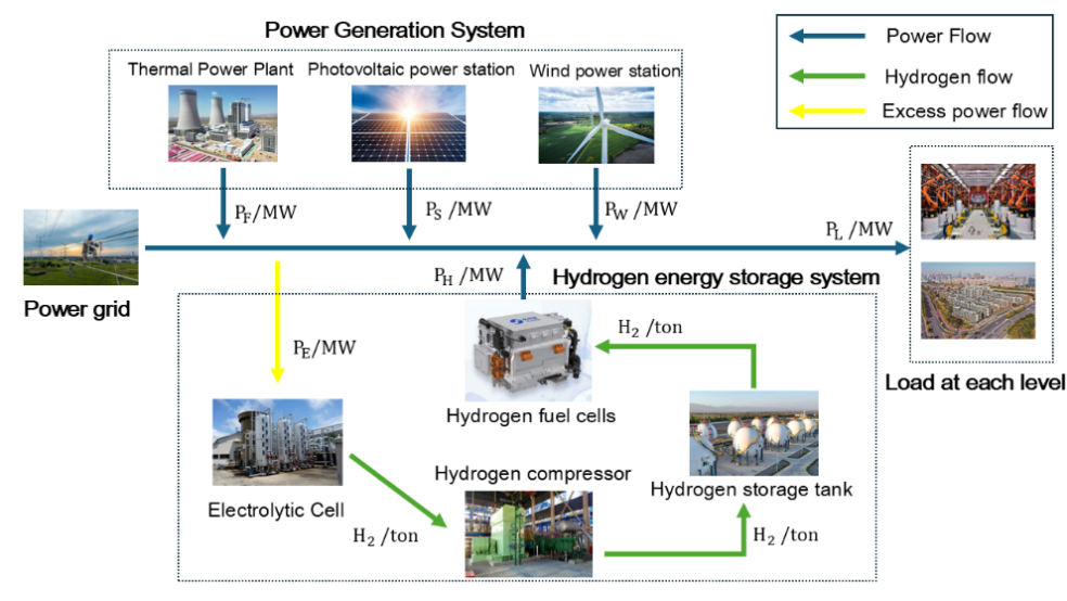 With the continuous growth of world energy demand and the rapid development of energy storage technology, adding energy storage systems to power systems to improve energy utilization efficiency and reduce energy waste caused by sustainable energy volatility will be a common form in the future. Optimizing energy scheduling is the key to improving system efficiency and economy. This paper proposes a wind, PV, thermal and hydrogen energy storage combined power grid system based on hydrogen energy storage technology. By considering constraints such as system power balance, sustainable energy output power, and energy storage system operation balance, a mathematical model is established and solved with the minimum operating cost as the objective function. Finally, the load and sustainable energy potential data of each California region are used to verify the superiority of the system proposed in this paper.