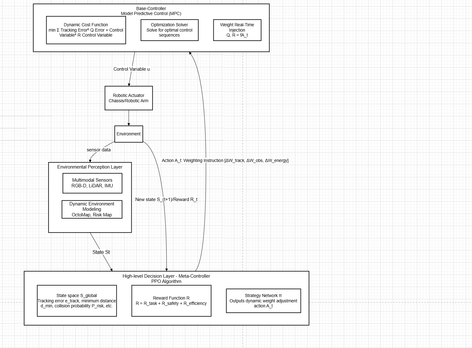 Trajectory tracking control for sorting robots in dynamic warehouse environments is challenging due to environmental uncertainty and frequent disturbances. The performance of traditional model predictive control (MPC) heavily relies on manually pre-tuned weight parameters in its cost function. This fixed configuration limits the ability to autonomously balance multiple objectives—such as trajectory tracking, obstacle avoidance, and energy consumption—in dynamic settings, thereby constraining adaptability and robustness.To address this, this paper introduces a hierarchical reinforcement learning framework for online autonomous adjustment of MPC weights. The framework consists of a high-level meta-controller and a low-level MPC executor. The high-level controller dynamically adjusts the MPC weight matrix based on the global environment state, enabling intelligent prioritization of control objectives. Comparative experiments in a high-fidelity Gazebo simulation demonstrate that the proposed method outperforms both fixed-weight MPC and PID controllers in tracking accuracy, task efficiency, safety, and energy consumption. The results validate the effectiveness of the approach and reveal an interpretable, learning-based decision-making mechanism, offering a reliable solution for high-performance robot control in dynamic environments.