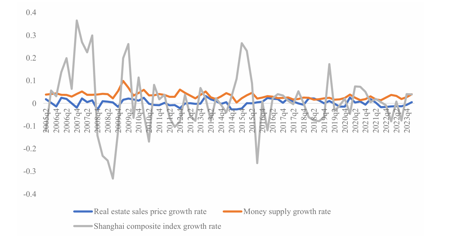 Since China enacted the housing system reform in late 1990s, specifically, the monetization of housing distribution has come into effect, so as the housing security system. Considering this policy and the availability of data, this paper chooses data of currency supply, property price index and Shanghai Security Composite Index from the fourth quarter of 2005 to the fourth quarter of 202, and finally forms 72 observations. Among them, the property price index is obtained from Fred. The quarterly data of China 's actual residential property prices from 2005 to 2023 released by the Bank for International Settlements, and the currency supply uses M2 data, that is, cash circulating outside the banking system plus demand deposits, time deposits and savings deposits, which generally reflect the liabilities of the financial system and the assets of the substantial economy. The M2 data used in this paper come from the monthly data of money and quasi-money in the monthly document of macro-economic library-financial industry-currency supply in CSMAR, and further use the arithmetic average to calculate the quarterly data of M2. The closing price of the Shanghai Security Composite Index uses the closing index data of the CSMAR market index database-domestic index trading data-domestic index monthly market documents. At the same time, the above three variables are logarithmically processed to eliminate heteroscedasticity to a certain extent. We use\( {M2_{t}} \)to represent the currency supply in the t-th quarter, and use\( {M2\_g_{t}}=log{M2_{t}}-log{M2_{t-1}} \)to calculate the growth rate of currency supply. Similarly,\( {Re_{t}} \)represents the property price index in the t-th quarter, and use\( {Re\_g_{t}}=log{Re_{t}}-log{Re_{t-1}} \)to calculate the growth rate of property prices. Finally,\( {Is_{t}} \)represents the price of the Shanghai Composite Index, and\( {Is\_g_{t}}=log{Is_{t}}-log{Is_{t-1}} \)is used to calculate the growth rate of the stock market index.
