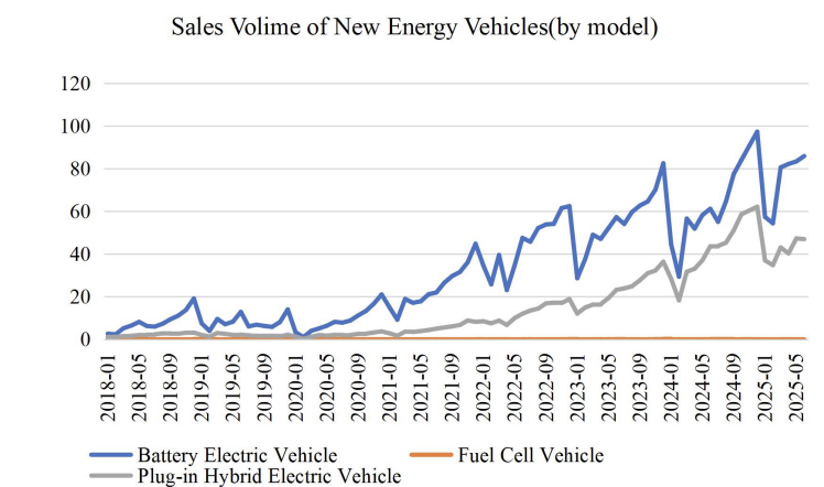 Secondly, different power-type vehicles show heterogeneous responses. Battery electric vehicles have the highest correlation with subsidies (Pearson coefficient 0.72). They experienced short-term fluctuations in the early stage of withdrawal, but achieved endogenous growth in the long term through large-scale production and technological upgrading; plug-in hybrid vehicles, due to a smaller withdrawal (20% in 2022) and their combination of low fuel consumption and no range anxiety, saw their sales increase 36 times from 2020 to 2025, far exceeding the 24-fold growth of battery electric vehicles; fuel cell vehicles, due to insufficient support in the passenger vehicle sector, have maintained sales of less than 0.2 million units.