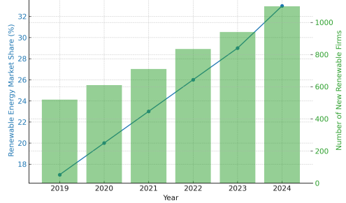 The future looks promising for the growth of new energy companies. In the U.S., large solar firms increased by approximately 45% from 2019 to 2024, while wind power developers' share grew by about 30%. This expansion is changing the electricity sector, impacting prices and shaping investment approaches. Meanwhile, traditional energy firms are also evolving. Increasing carbon regulations and the requirement for emissions reporting are prompting oil and gas firms to invest more in renewables. Since 2021, it’s estimated that international oil companies have allocated roughly 8% to 12% of their budgets to renewable initiatives. This transition blurs the boundaries between conventional and renewable energy sources, leading to greater competition. Table 1 shows the market structure changes of renewable energy and traditional energy industries from 2019 to 2024.