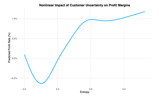 This study reveals several key insights into the role of behavioural uncertainty in credit risk. Our analysis confirms that entropy is a statistically robust determinant of profit, exhibiting a clear and significant nonlinear effect. This finding reframes the conventional wisdom that uncertainty is solely a source of risk. In fact, high-uncertainty customers are not inherently bad risks; they often deliver higher profits due to characteristics like larger loan sizes or more favourable interest terms. Our research complements existing literature that has explored the link between uncertainty and profitability. Specifically, we provide quantitative evidence that supports the thesis of Chen et al. [8], who posited that profit can be derived from uncertainty. Our findings also align with the work of Agarwal and Zhang [9], who noted non-monotonic risk–return patterns, by offering behavioural uncertainty as a plausible explanation for this phenomenon.