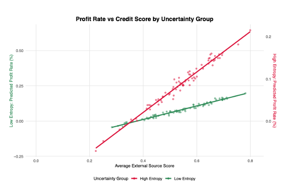 According to Figure 3, a dual-axis comparison of Average External Source Score (EXT_SOURCE_avg) reveals that entropy moderates the relationship between credit score and profit, clearly distinguishing two trends: a steeper slope for high-entropy customers and a more moderate one for the low-entropy group. This indicates that incremental improvements in credit scores lead to substantially larger profit increases among high-uncertainty customers, demonstrating a previously hidden synergy between behavioural uncertainty and traditional risk metrics captured by our model.
