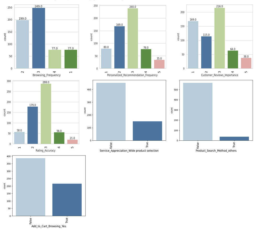 Based on the Distribution Profiles of Key Behavioral Variables (Figure 2), Cart Addition Browsing reveals a near-balanced split, with 249 customers actively adding items to carts (indicating high purchase intent) versus 199 passive browsers, underscoring its critical role as a behavioral intent signal identified in feature importance analysis. Personalized Recommendation Frequency exhibits that 240 users report high exposure (ratings 4-5), confirming intensive algorithmic personalization efforts aligned with its predictive significance for both purchase frequency and satisfaction. Other variables show distinct patterns, validating key behavioral segments, with cart activity and recommendation frequency holding particular operational relevance.