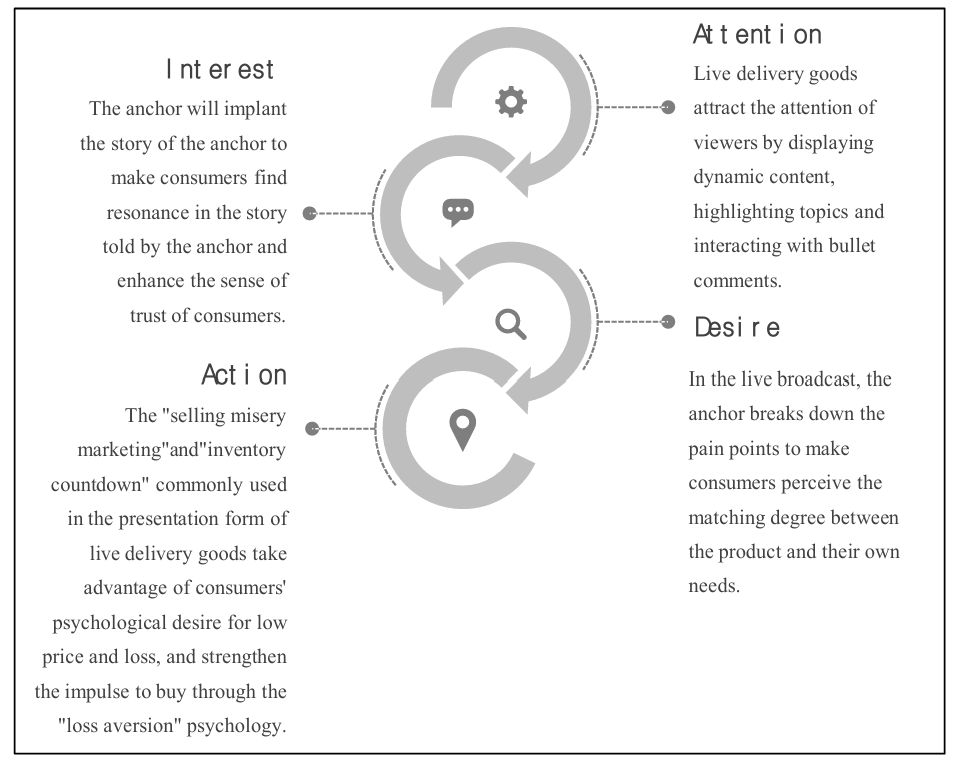 Individual behaviour is generated through a series of choices, decisions, or intentions that eventually translate into actual behaviour. In marketing, consumer purchase intention has always been a core research topic, and its generation path is similar to the process of intention formation in psychological research, both manifested as consumers having certain behavioral tendencies after receiving external stimuli [3]. Consumer psychology is a series of mental activities that occur throughout the consumption process of consumers, running through the entire process of consumer decision-making and governing consumer behaviour and purchase decisions. For example: trust psychology, conformity psychology, authority psychology, pragmatism psychology, cheapness psychology, scarcity psychology, loss psychology, etc. The professional ability and interactivity of the live-streamer, the cognitive attitude and consumption behaviour of the live-streamer towards the user, the interaction mode, the promotion behaviour, the marketing methods, etc., will have an impact on the consumer psychology [3,4]. Through AIDA model analysis (Figure 1), it can be found that consumers who make purchases through live-streaming sales marketing will first be influenced by external environmental stimuli and the conscious processing of individual internal psychological activities. Secondly, consumer awareness and opinion recognition will enhance consumers' purchasing psychology, thereby stimulating customers' "scarcity perception" and "demand reinforcement", and ultimately generating consumption behaviour.