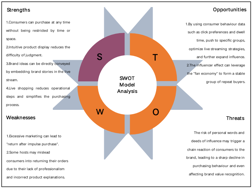 Through the SWOT model analysis (Figure 2) and 4CS model analysis (Table 1), it can be found that live-streaming marketing can largely guide consumers to make purchases through emotional factors by reducing the cost of information acquisition, cognitive cost and price cost of the goods [6,7]. At the same time, the specific oral expression of the streamer will inadvertently convey the brand awareness and product value of the enterprise to consumers, causing consumption behaviour to arise along with brand recognition [7]. However, due to the strong requirements for the ability and public awareness of the live-streamer themselves, enterprises should also pay attention to the social evaluation of the live-streamer themselves when choosing live-streamers for promotion, to avoid the brand value being questioned by society due to the live-streamer's inappropriate remarks [7,8].