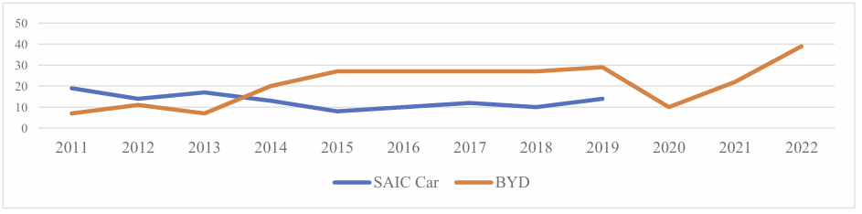 From the carbon disclosure data presented in Figure 1, BYD, as a representative of new energy vehicle companies, has shown outstanding performance in improving carbon emission decomposition indicators and other related aspects. The sharing of carbon data is also gradually developing. Compared with traditional car company SAIC Sedan, BYD's carbon disclosure related data is complete and presents different development trends, especially after 2020, with a more obvious trend of change. The penetration rate of low-carbon technology among suppliers exceeds 60%, which is higher than the industry average of 35%. This improvement stems from the resource integration capability of core enterprises, which reduces supplier emission reduction costs through technology sharing and solves the problem of "difficult carbon emission accounting" through data platforms, in line with the transmission logic from "collaborative practice" to "capability enhancement".